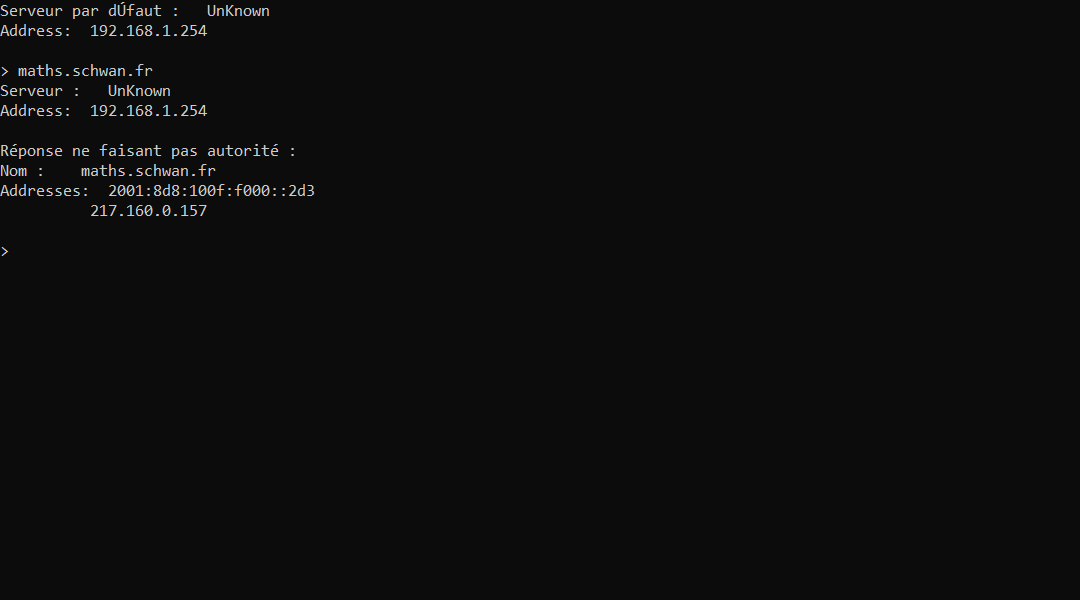 Travail à faire - Dans nslookup , taper maths.schwan.fr.